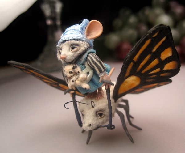 Miniature mouse flying w/ moth and puppy one of a kind dollhouse mini sculpture SOLD